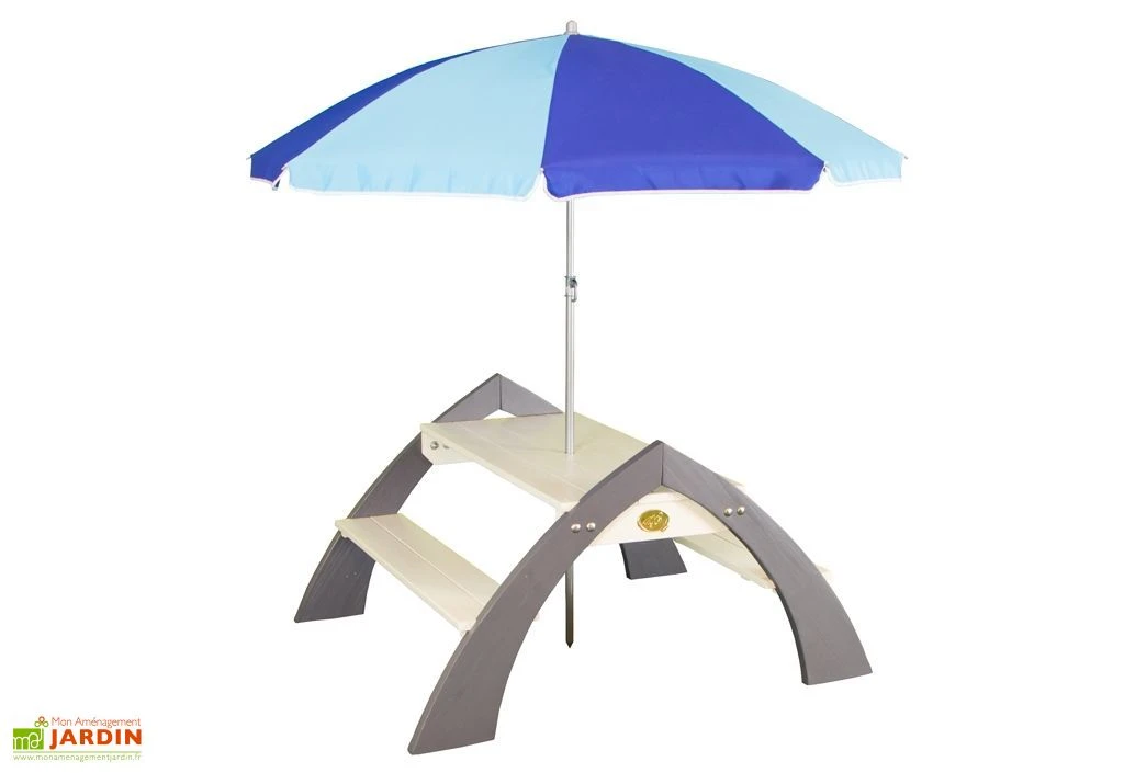 La table de pique-nique pour enfant Kylo est fabriquée en bois de Hemlock. Il s’agit d’un bois naturellement imputrescible, qui ne s’infecte pas et qui est insensible aux champignons et aux insectes. Étant non traité chimiquement, le bois est écologique et reste parfaitement adapté à nos enfants. La table de pique-nique est accompagnée de son parasol.