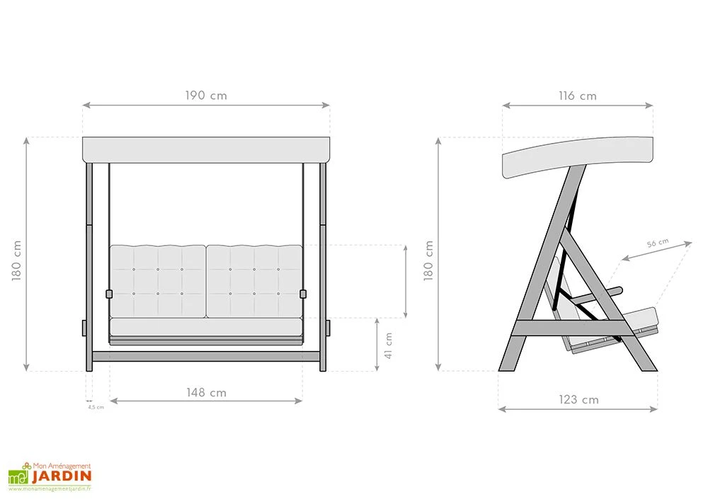 L’assise de la balancelle mesure 148 x 56 cm ce qui lui permet de recevoir 2 à 3 personnes confortablement. Elle se situe à une hauteur de 41 cm et pourra supporter un poids jusqu’à 350 kg. Le revêtement des coussins d’assise, de dossier et de toit est fabriqué en polyester et résiste aux rayons UV, à l’humidité et à la saleté.