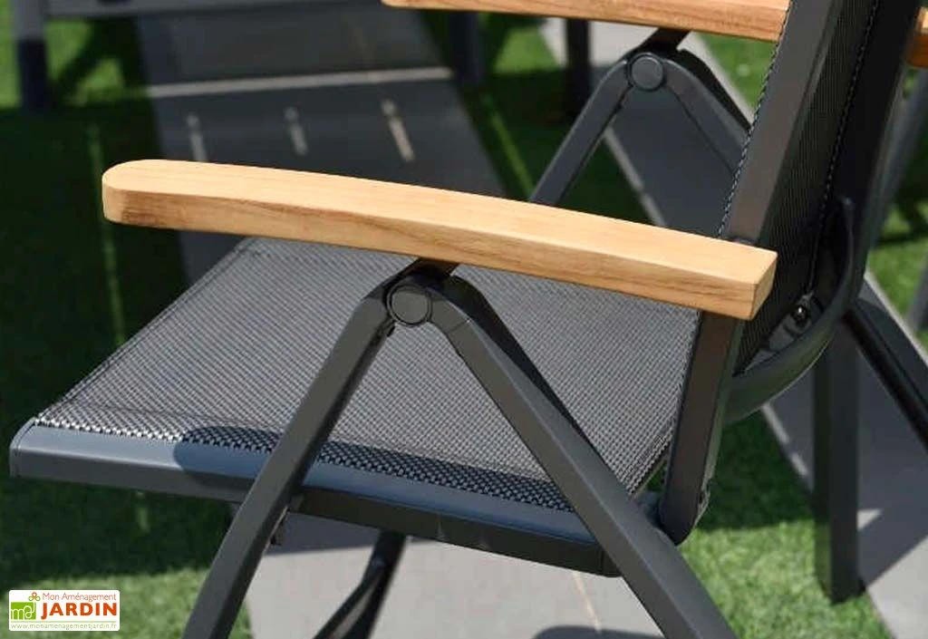 Cette chaise de jardin pliante est dotĂ©e dâune structure en aluminium, un matĂ©riau souvent privilĂ©giĂ© pour le mobilier dâextĂ©rieur car naturellement insensible Ă la corrosion. Lâassise et le dossier sont pour leur part conçus en polyester tandis que les accoudoirs sont faits de teck, un bois rĂ©sistant aux intempĂ©ries, mĂȘme sans traitement.Â