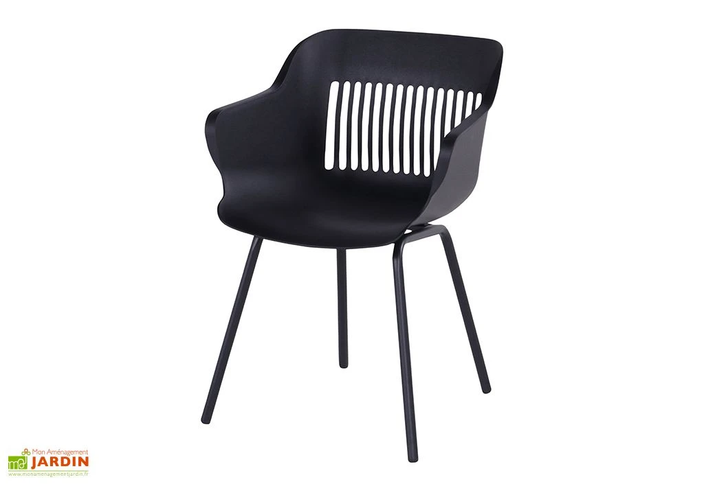 Solide et parfaitement stable, le piètement de la table et des chaises est fabriqué en aluminium, un métal intéressant puisque naturellement insensible à la rouille. Le plateau de la table est pour sa part fait en HPL, un stratifié haute pression robuste et facile à nettoyer. Les assises des chaises de jardin se montreront tout aussi résistantes car conçues en résine. Elle pourront par ailleurs supporter un poids maximum de 130 kg.