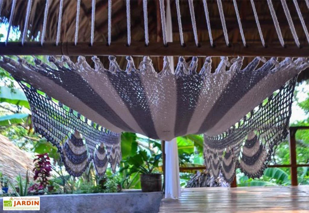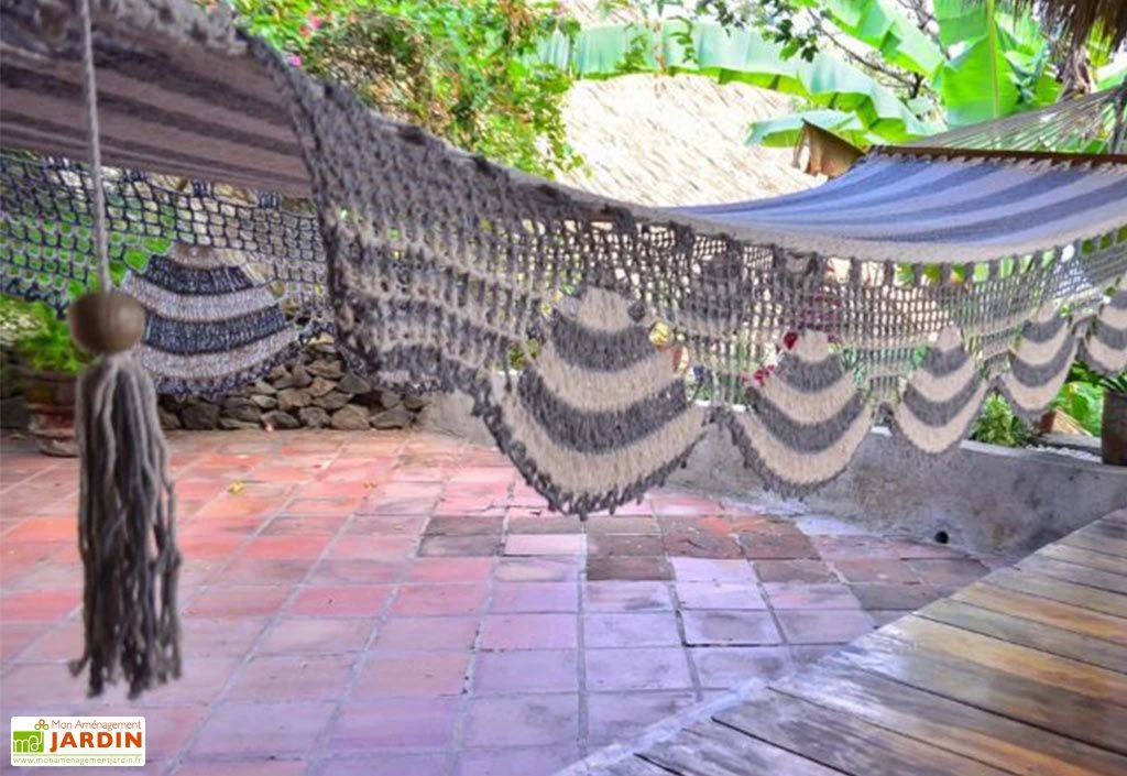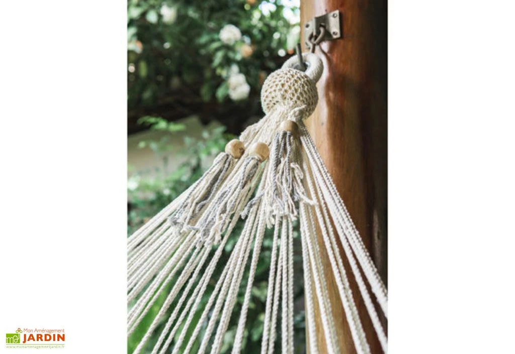La toile de ce hamac suspendu est tissée à la main. Elle est intégralement conçue en coton et mesure 100 cm de large sur 237 cm de long (longueur totale : 361 cm). Très robuste, elle pourra supporter un poids maximal de 170 kg et vous accompagnera durant de nombreuses années. Elle pourra également être facilement lavée si besoin, afin de conserver son éclat. Notez enfin qu’un kit de fixation, indispensable à l’installation du hamac, vous est proposé dans l’onglet « Accessoires ».