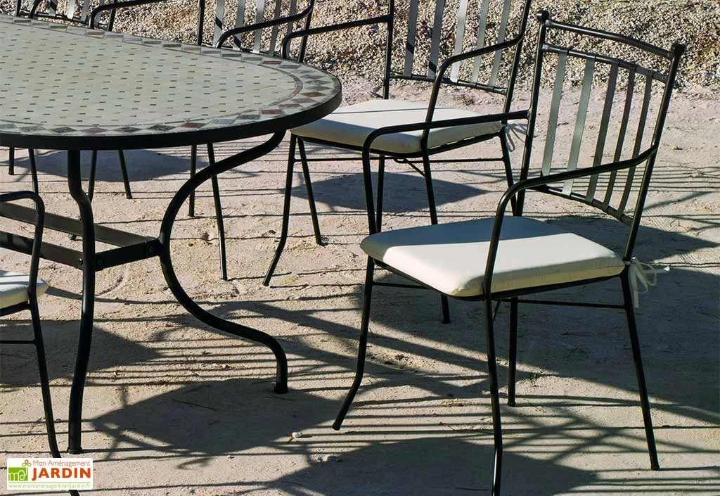 La table de jardin dispose d’un plateau en mosaïque offrant un aspect élégant. Elle affiche des dimensions de 200 x 100 cm, pour 75 cm de haut. Les fauteuils sont dotés d’accoudoirs pour un maximum de confort. Ces fauteuils de jardin sont également équipés de coussins avec une housse amovible en dralon, un tissu 100 % acrylique résistant aux rayons UV. Ils mesurent 54 x 54 x 90 cm, avec une hauteur d’assise de 44 cm.