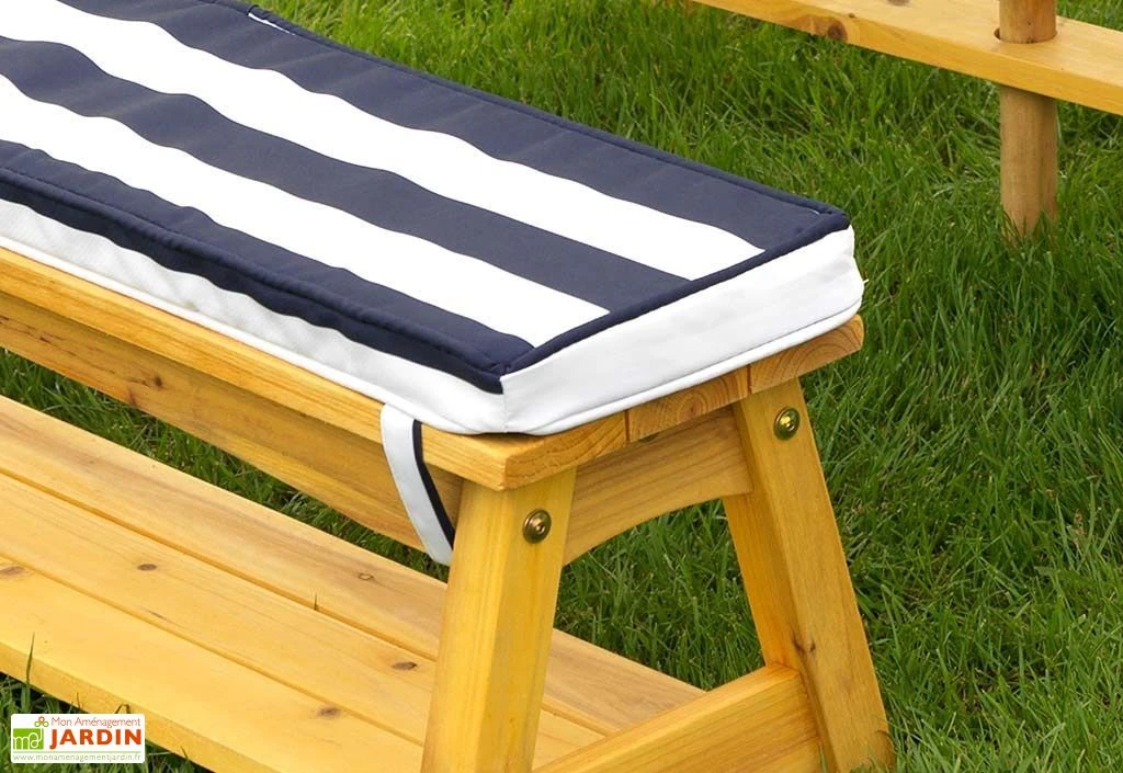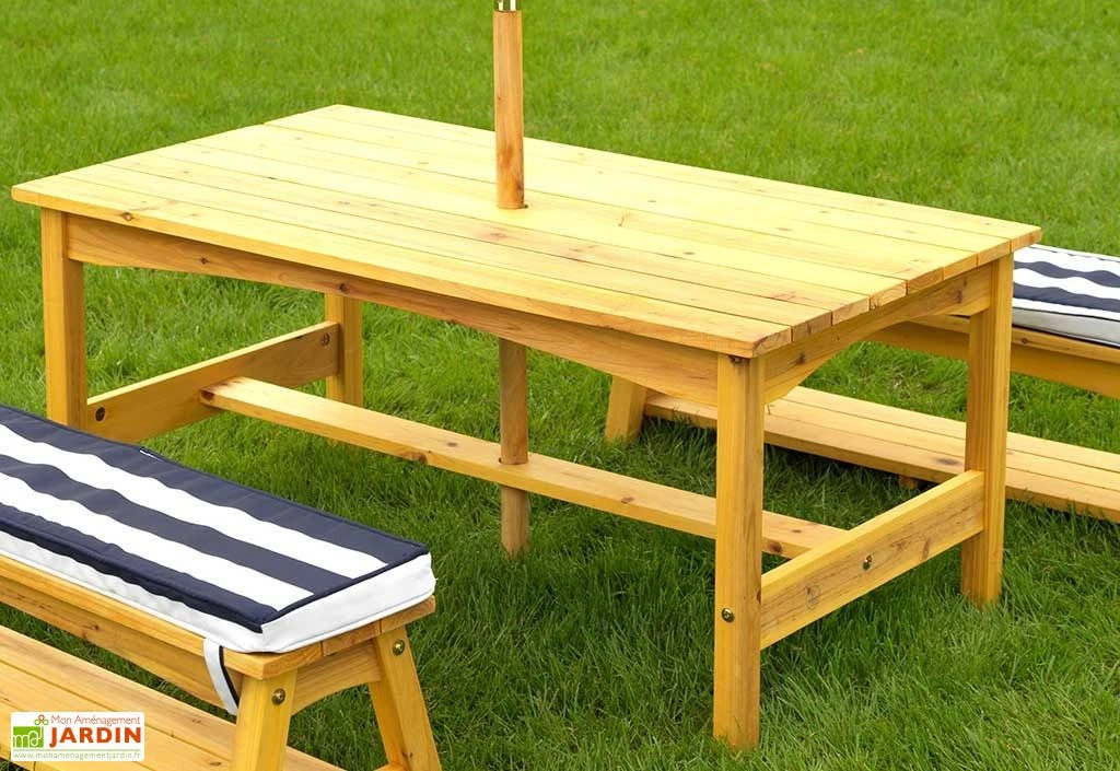 Le salon de jardin pour enfants de Kidkraft est tout en bois. Sa taille est adaptée aux enfants de 3 à 8 ans. Il se compose d’une table de 107 cm de longueur, 58 cm de largeur et 48 cm de hauteur, de 2 bancs de 91 x 30 x 33 cm et d’un parasol de 154 cm de hauteur.