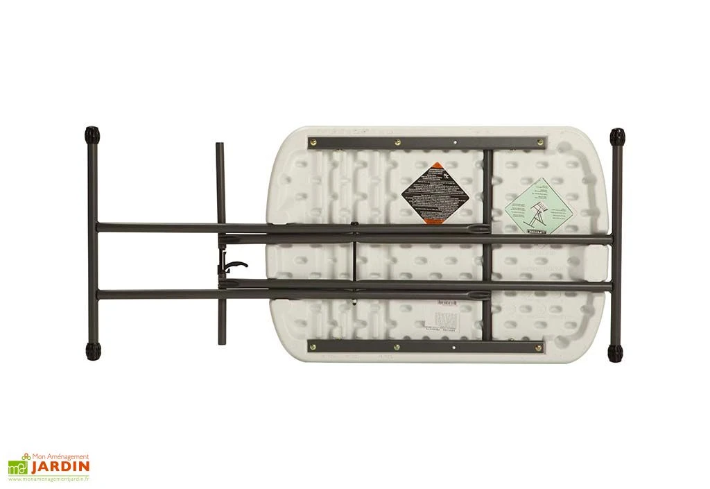 Facile à nettoyer, cette table de jardin est dotée d’un plateau en polyéthylène haute densité (PEHD) de 65,9 x 45,6 cm et le tout pourra être réglé en hauteur entre 61 et 71,1 cm. La structure de la table est quant à elle faite d’acier traité de sorte à ne craindre ni les intempéries, ni la corrosion.