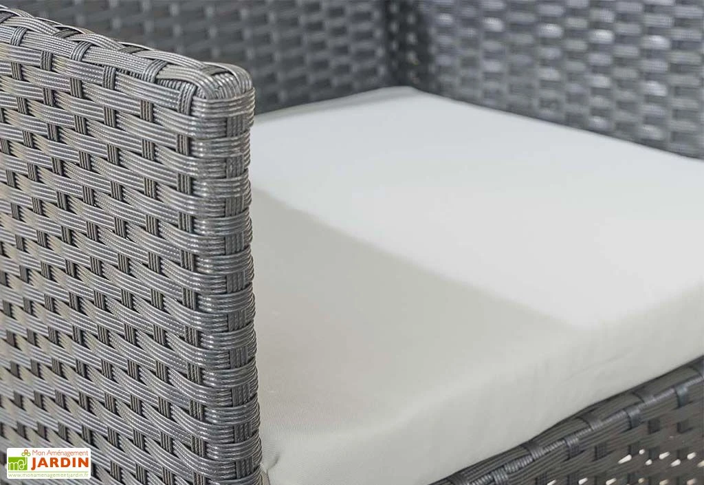 Le salon de jardin Barcelone de chez Wilsa est parfait pour profiter de moments de détente en extérieur, en famille ou entre amis ! Il offre quatre places confortables et se compose de deux fauteuils de jardin, d’un canapé deux places et d’une table basse rectangulaire avec plateau en verre de 5 mm d’épaisseur que vous pourrez choisir en noir, gris ou finition marron.