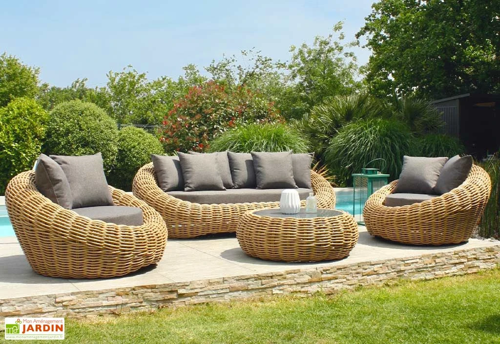 La table basse, les fauteuils et le canapé sont habillés de résine tressée dont l’apparence ressemble à s’y méprendre à du rotin. La résine tressée est parfaitement adaptée à une utilisation en extérieur. Elle ne craint ni les intempéries, ni les rayons UV, et ne nécessite aucun entretien particulier.