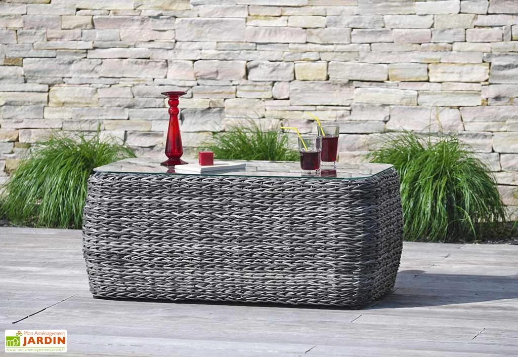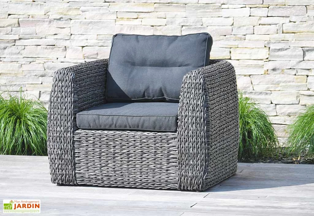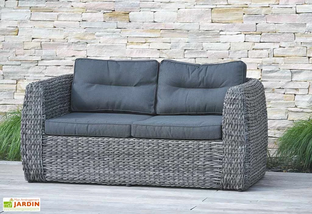 Ce salon de jardin est composé d’une banquette, de 2 fauteuils, d’une table et d’une desserte. Il est composé d’une structure en aluminium recouverte par un revêtement en résine tressée imitant fidèlement l’aspect de la feuille de bananier.