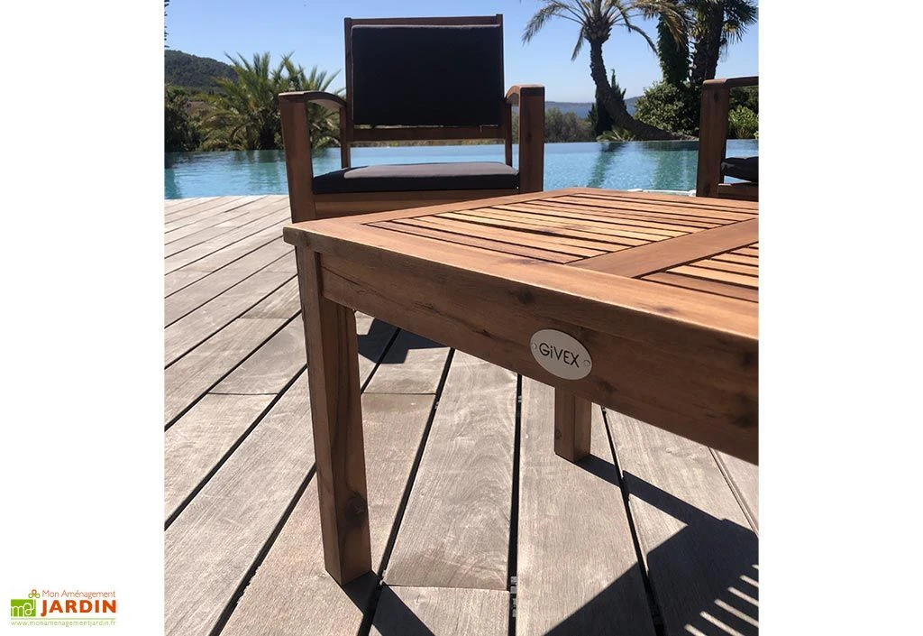 Les différents éléments qui composent ce mobilier de jardin sont entièrement conçus en bois d’acacia huilé. Parfaitement adapté à la vie en extérieur, l’acacia est un bois résistant qui ne nécessite que peu d’entretien. Le bois utilisé est par ailleurs certifié FSC, ce qui indique qu’il provient de forêts gérées dans le respect de l’environnement. Notez enfin que le canapé et les fauteuils sont livrés accompagnés de coussins gris anthracite, pour un confort optimal.