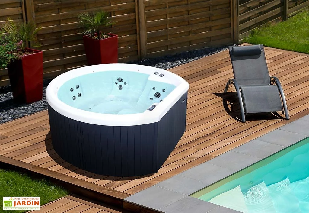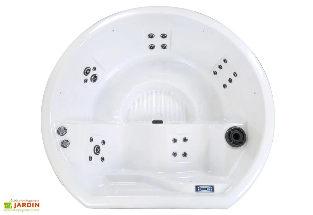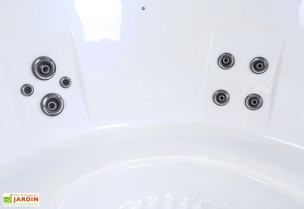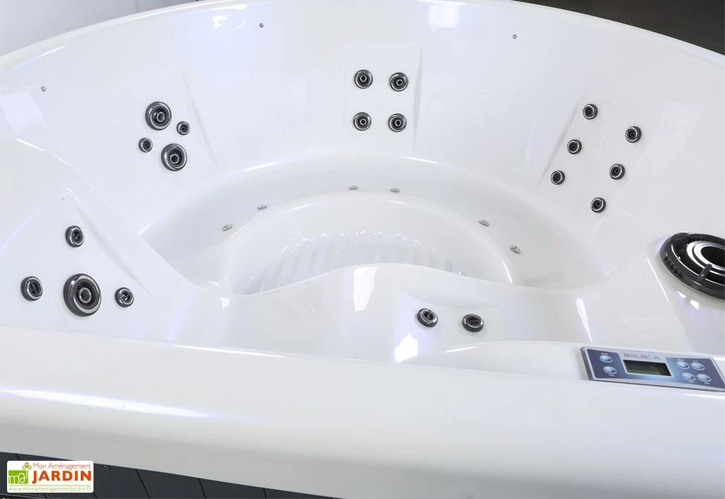 Ce spa d’extérieur est un spa « plug and play », ce qui signifie qu’il vous suffit de l’installer à l’endroit désiré et de le brancher à une prise électrique pour profiter de ses bienfaits ! Sa cuve intègre 27 jets massants, dont 17 sont orientables et 10 bi-rotatifs. Ces jets hydromassants pourront être aisément gérés via le panneau de contrôle Balboa TP500 dont est équipé le jacuzzi, tout comme la température de l’eau (chauffage 2 kW Balboa, max. 38°C). La luminosité des LEDs présentes dans le bassin pourra également être ajustée via ce panneau de commande, ce spa étant doté d’une fonction chromothérapie !