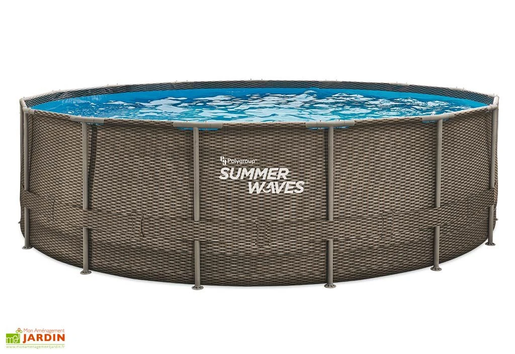 Ronde et moderne, la piscine hors-sol tubulaire SUMMER WAVES possède un diamètre de 4,57 m pour 1,22 m de haut. La structure en acier, composée de jambes verticales de 38,1 mm de diamètre et de poutres horizontales de 44,5 mm de diamètre, assure une armature robuste. Le liner est quant à lui fabriqué à partir de PVC triple épaisseur de haute qualité, certifié résistant aux rayons UV et aux produits de traitement de l’eau. L’extérieur de la piscine présente un effet tressé marron foncé et l’intérieur du bassin arbore un coloris bleu.