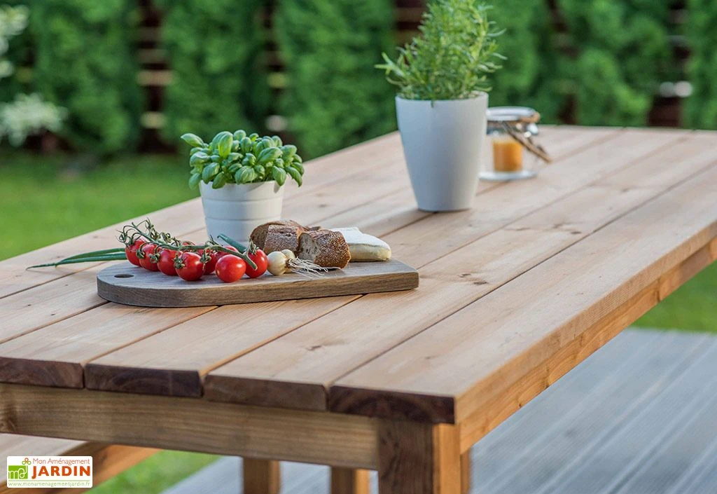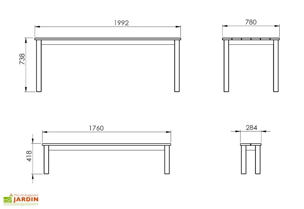 La table en bois mesure 199,2 x 78 cm et 73,8 cm de hauteur. Ses deux bancs mesurent 176 x 28,4 cm et 41,8 cm de hauteur. Le bois possède une épaisseur de 30 mm et les planches qui constituent les plateaux mesurent 13 cm de largeur pour la table et 14 cm pour les bancs. Les pieds possèdent une section de 68 x 68 mm.