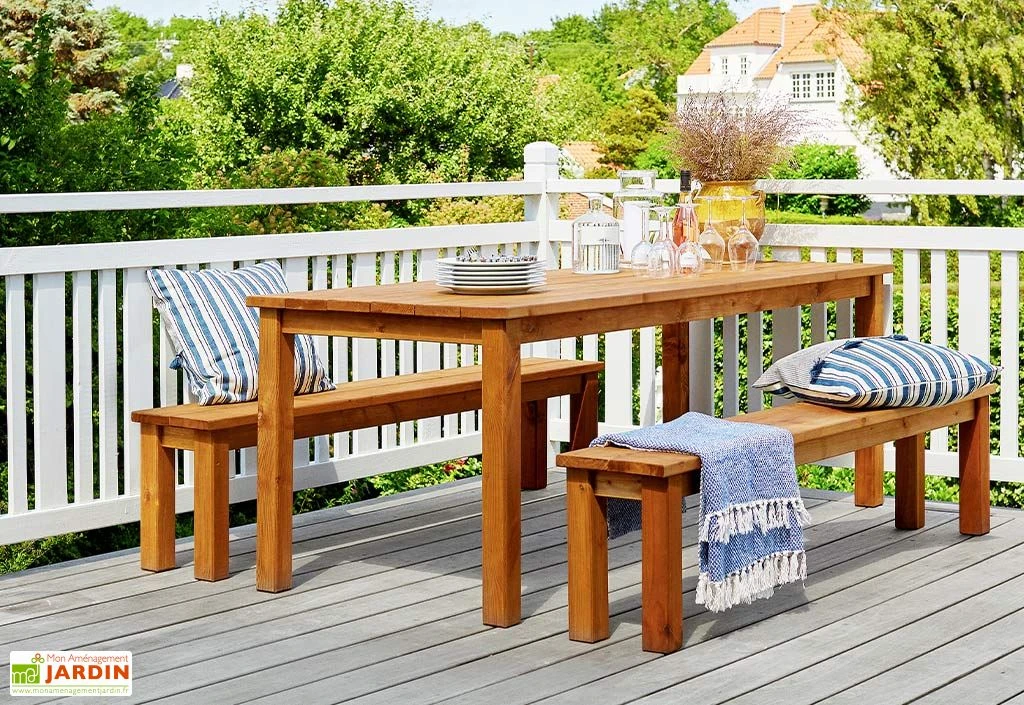 Cette table de jardin signée Ekju est livrée avec ses deux bancs et pourra recevoir 4 personnes confortablement. L’ensemble est fabriqué en bois massif à partir de pin du Nord de l’Europe. Une imprégnation autoclave classe III colorée protège le bois contre les agressions extérieures tout en lui offrant une belle teinte brune. Pensez à appliquer un saturateur annuellement pour que le bois conserve sa couleur.
