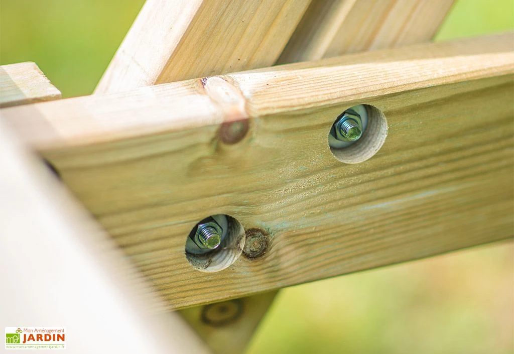Pratique, cette table forestière est dotée de bancs rabattables de 24,2 cm de profondeur. Le bois massif utilisé pour sa conception possède une épaisseur de 42 mm et chaque planche mesure 11,6 cm de largeur.