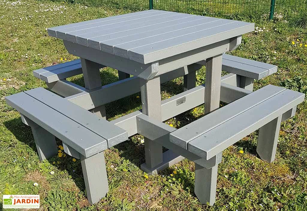Cette table de pique-nique carrée pourra accueillir jusqu’à quatre personnes le temps d’un repas ou d’un goûter en plein air. Elle est dotée d’un plateau de 90 cm de côté, de quatre assises et trouvera parfaitement sa place dans un parc ou autre lieu destiné à accueillir du public. Cette table d’extérieur est également disponible dans trois coloris au choix (gris, carbone ou marron) afin que vous puissiez opter pour celui qui s’intègrera le mieux dans l’espace à aménager.