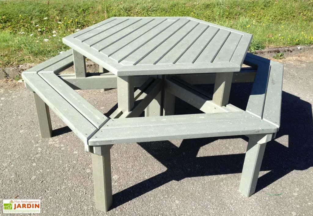 Cette table de pique-nique hexagonale trouvera parfaitement sa place dans un parc ou une cour d’école, par exemple. Elle est conçue pour offrir entre 6 et 12 places assises et est disponible en gris, marron ou carbone, au choix, afin de s’intégrer au mieux dans l’environnement à aménager. Son plateau de 166 cm de diamètre vous permettra de profiter de votre repas dans de bonnes conditions, pour un moment de convivialité en plein air.