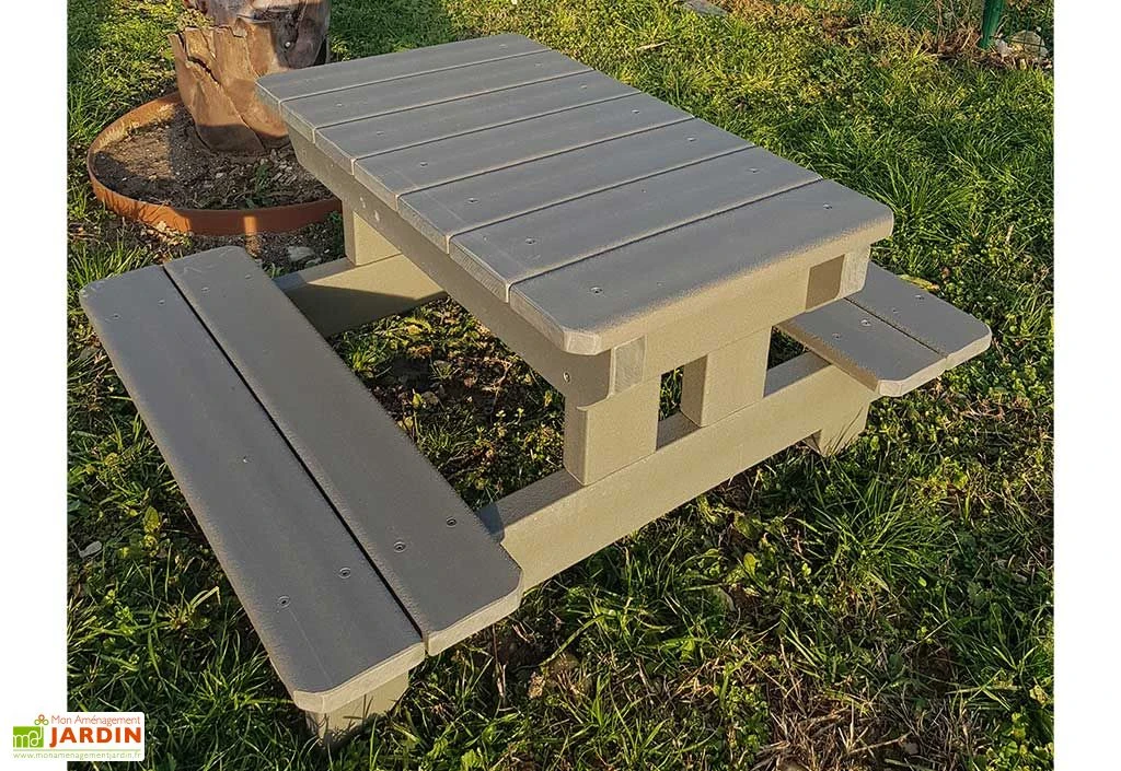 Cette table de pique-nique en composite profite d’une garantie de 15 ans contre le pourrissement et de 2 ans sur la visserie incluse.