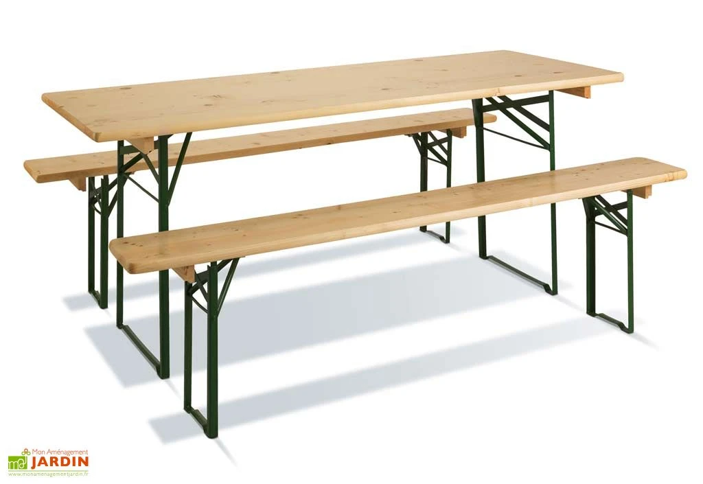 Cette table de jardin affiche des dimensions de 2,20 x 0,8 x 0,76 m (l,l,h). Elle est accompagnée de ses 2 bancs de 2,20 x 0,25 x 0,50 m (l,l,h). La hauteur de l’assise s’élève à 50,6 cm et celle du plateau à 75,6 cm. Le plateau possède une épaisseur de 28 mm. La table pliante et ses deux bancs sont en sapin certifié FSC. Le bois est donc issu de forêts gérées de manière durable et responsable. Il a également été verni pour une finition parfaite. Le reste de la structure est en métal recouvert de peinture antirouille verte. Votre salon de jardin pourra donc rester en extérieur et résistera parfaitement à l’humidité.